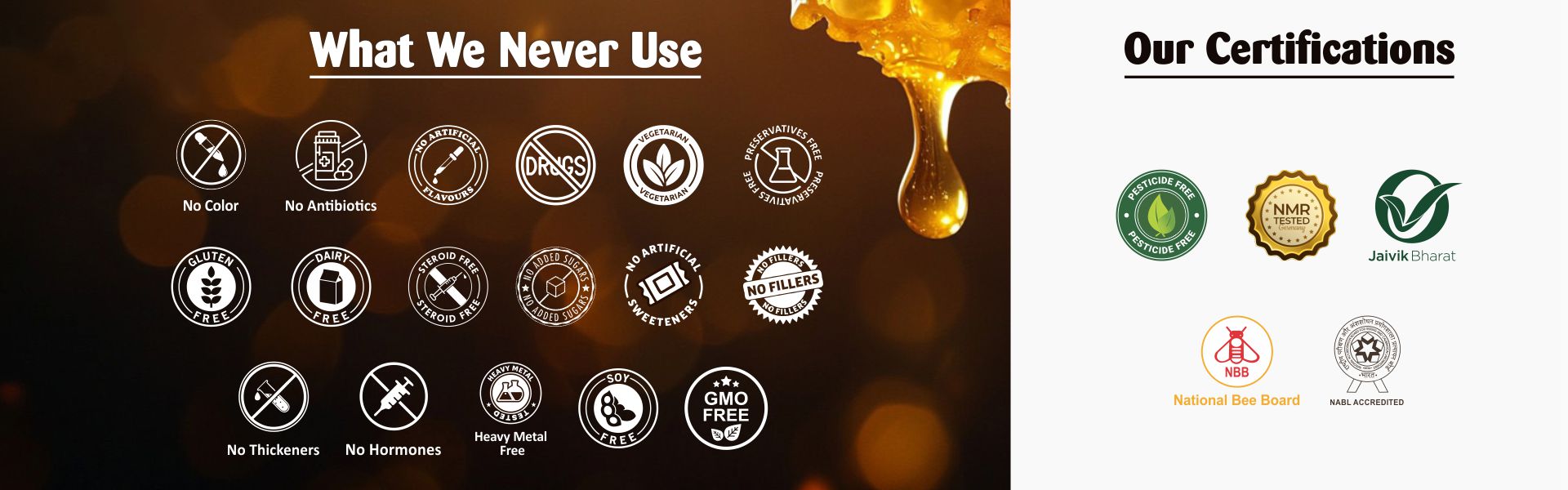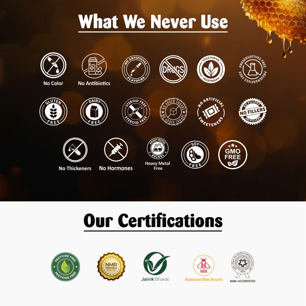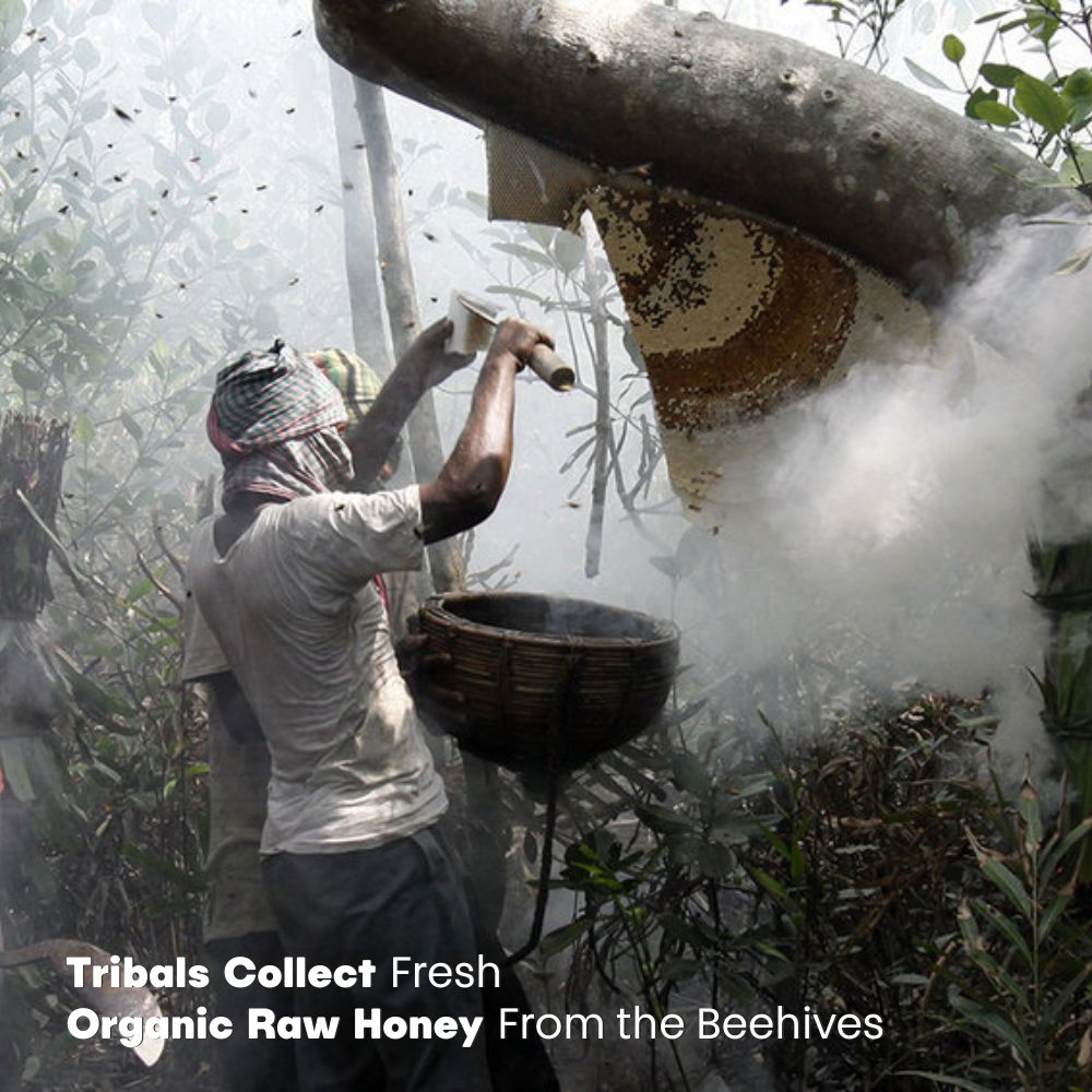 The honey collected by the tribal beekeepers is given to you in the most authentic form without any added sugar, artificial or natural sweetener, free from preservatives, additives, colors or any kind of foreign substance, other than natural raw honey.